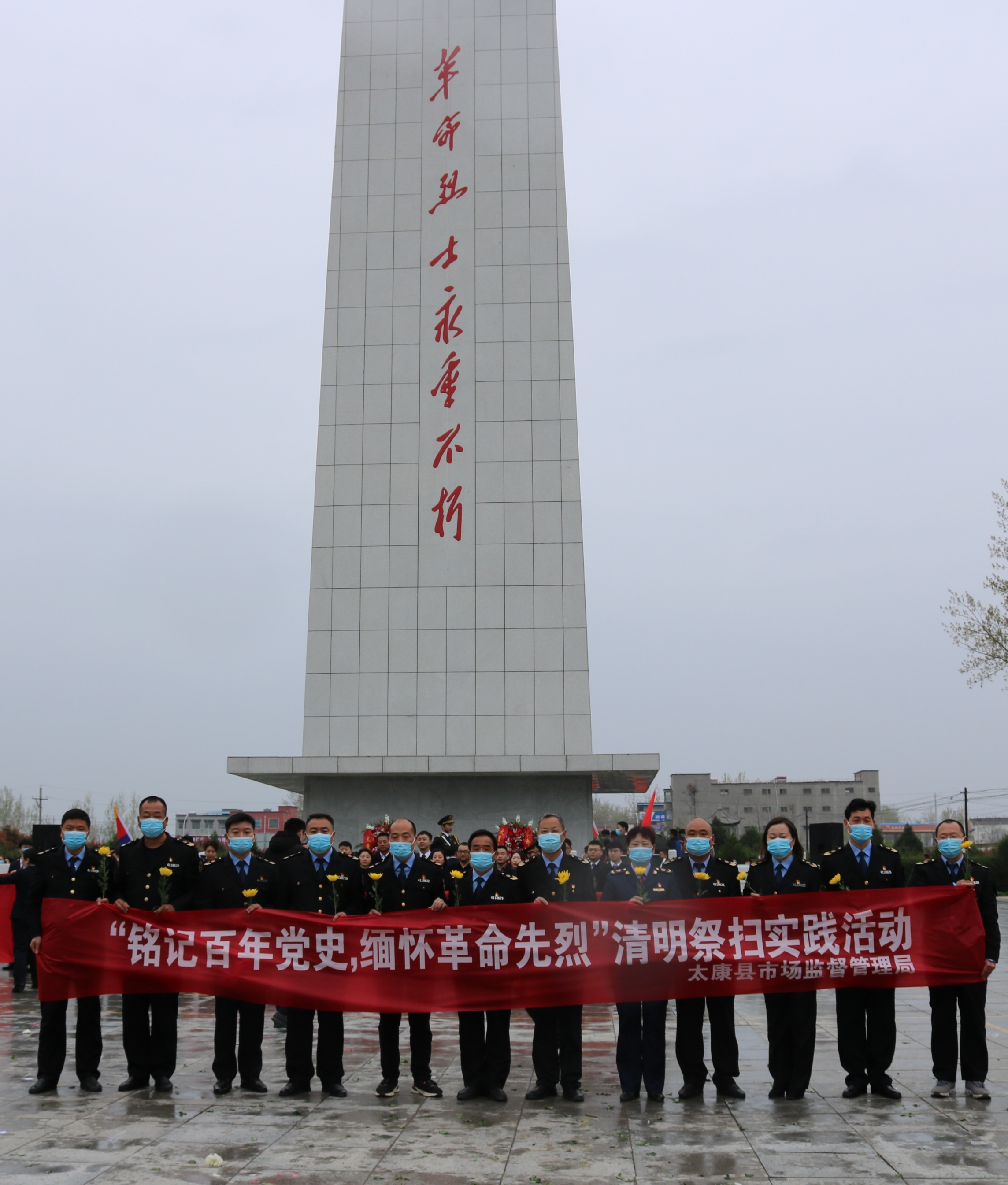 莊嚴(yán)肅穆的革命烈士紀(jì)念碑前,太康縣市場(chǎng)監(jiān)管局黨員干部手持鮮花整齊列隊(duì),合唱中華人民共和國(guó)國(guó)歌,儀態(tài)端莊、精神飽滿、莊嚴(yán)肅立,向革命烈士默哀并行三鞠躬禮。隨后,大家依次緩步來(lái)到紀(jì)念碑前,向烈士紀(jì)念碑敬獻(xiàn)鮮花,深切緬懷先烈們不屈不撓、可歌可泣的英雄事跡和偉大的革命精神。