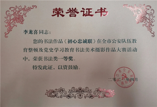 本次大賽,我市民輔警積極參加,踴躍報(bào)送,選送書(shū)法、美術(shù)、攝影作品30余件。其中扶溝縣公安局宣傳科李龍喜、交警大隊(duì)厲夯等人的書(shū)法《初心忠誠(chéng)聯(lián)》《習(xí)近平講話(huà)選抄》等作品分別榮獲書(shū)法類(lèi)一等獎(jiǎng)、二等獎(jiǎng);扶溝縣公安局宣傳科閆曉鳳等人的攝影作品《晨讀》、《走訪話(huà)安全》等分別榮獲攝影類(lèi)二等獎(jiǎng)、三等獎(jiǎng)。此次大賽,全面筑牢了民輔警忠誠(chéng)履職的思想根基,切實(shí)把教育整頓及黨史學(xué)習(xí)教育活動(dòng)的成果轉(zhuǎn)化為思想成果和工作成果。充分展示了扶溝公安堅(jiān)定的理想信念和良好的精神風(fēng)貌。②9