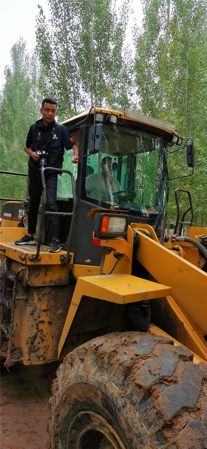 記者李龍周來到扶溝縣曹里鄉(xiāng)賈魯河擺渡口大閘附近,為找到更為合適的拍攝角度記者爬上了救災鏟車。