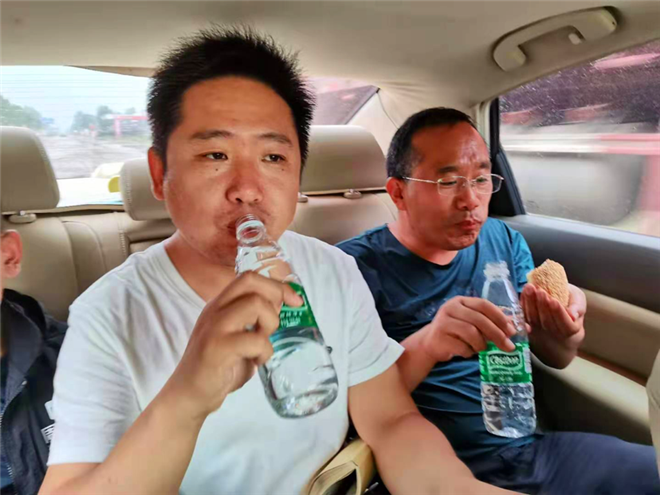 記者連續(xù)在扶溝賈魯河防汛一線采訪一整天時間,圖為周口日報記者張勁松、張洪濤在采訪車中吃飯。
