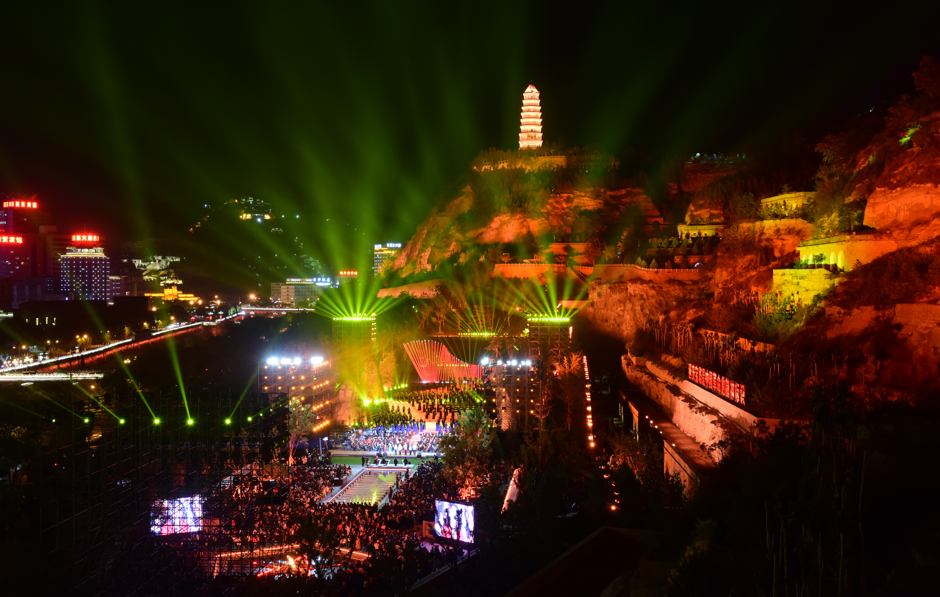 夜幕降臨,延安的寶塔山上,一場融實景、音樂和燈光為一體的燈光秀“講述”著延安的紅色歷史。延水河畔,一批批游客前來“打卡”。
