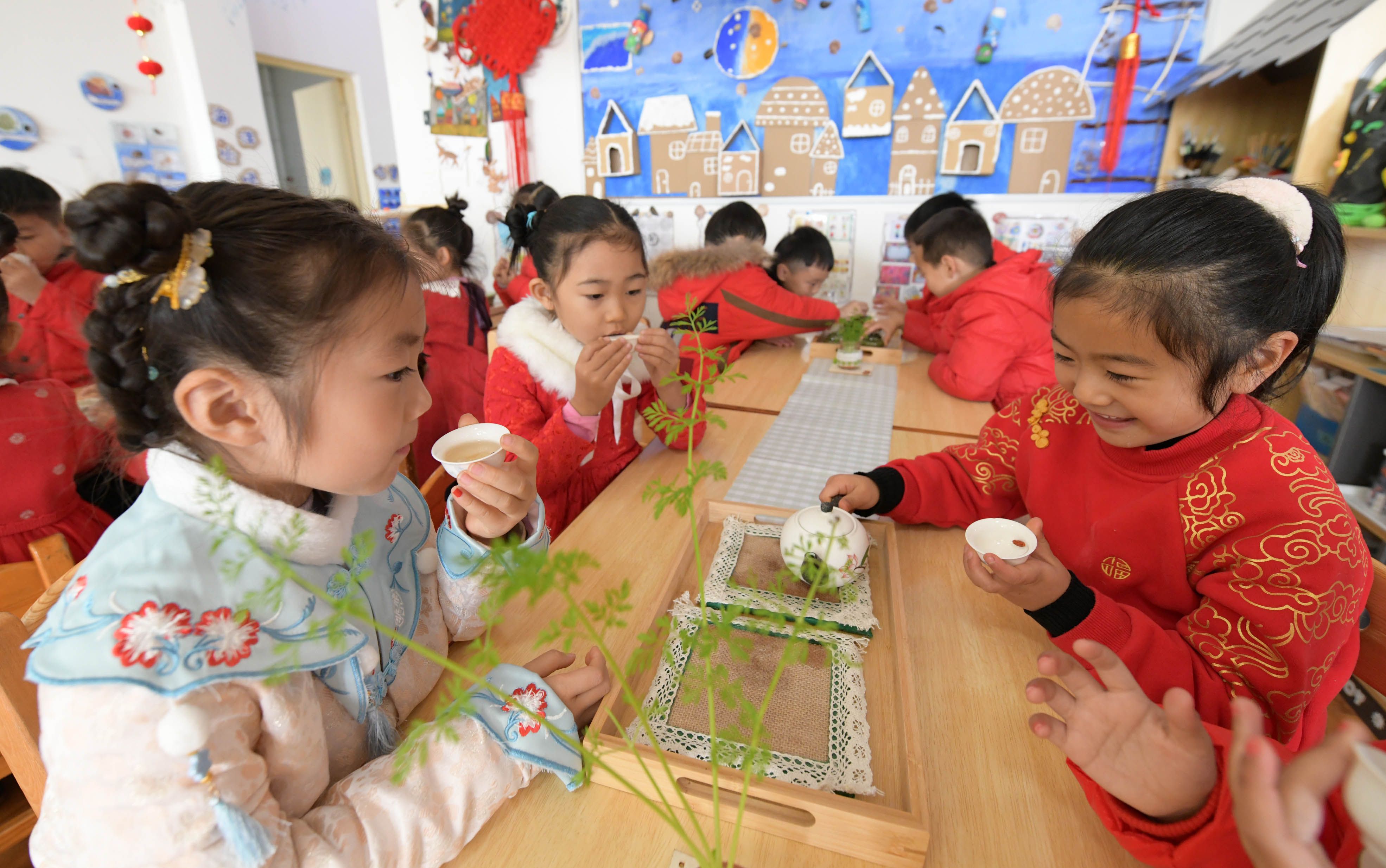 小朋友們學(xué)習(xí)傳統(tǒng)茶藝,喝冬至暖茶。