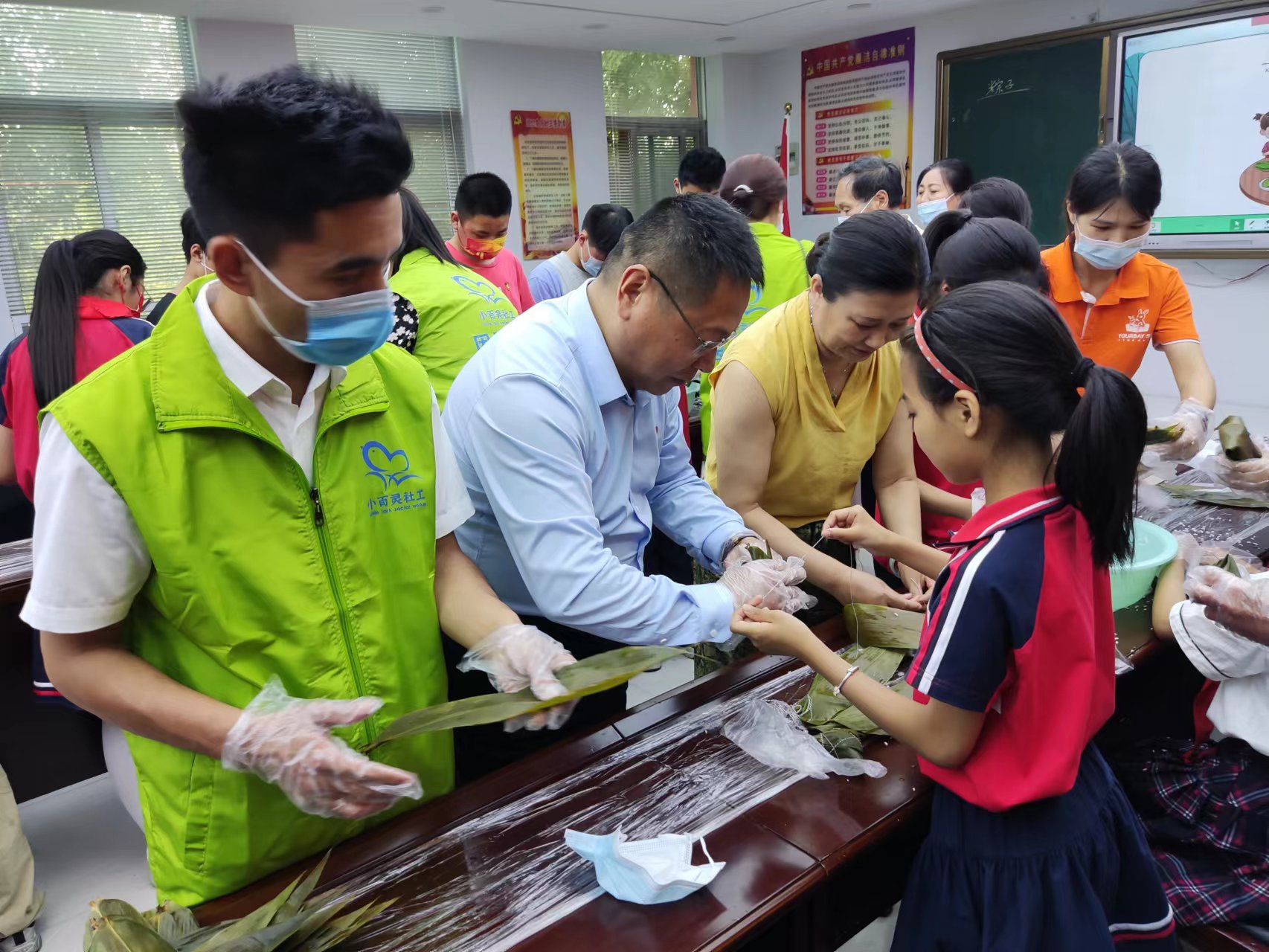 活動(dòng)中,文昌小學(xué)教師通過PPT、游戲等形式,向孩子講解端午節(jié)的來(lái)歷、習(xí)俗及有關(guān)端午節(jié)的故事,引導(dǎo)孩子弘揚(yáng)中國(guó)傳統(tǒng)文化。文昌小學(xué)社工站志愿者給孩子表演了影子劇《最愛的,是我》。周口師范學(xué)院工作人員向同學(xué)們講解了包粽子的方法。在社工的指導(dǎo)下,一雙雙忙碌的小手穿梭在一張張翠綠的粽葉間。社工們還為每位孩子準(zhǔn)備了粽子禮包,讓他們帶回家給爺爺奶奶嘗一嘗。
