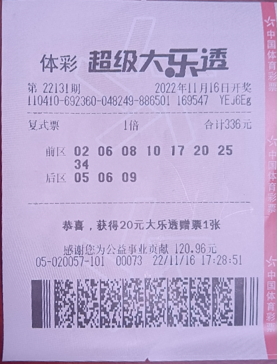 11月16日,體彩大樂(lè)透第22131期開(kāi)獎(jiǎng),開(kāi)獎(jiǎng)號(hào)碼為:前區(qū)02、06、08、10、17,后區(qū)05、06。本期通過(guò)2.80億元銷(xiāo)量,為國(guó)家籌集彩票公益金1.01億元。本期全國(guó)開(kāi)出13基本投注一等獎(jiǎng),單注獎(jiǎng)金723萬(wàn)元,分落河南(3注)、浙江(2注)、福建(2注)、云南(2注)、河北、黑龍江、山東、湖北。第22131期開(kāi)獎(jiǎng)后,獎(jiǎng)池滾存10.23億元。