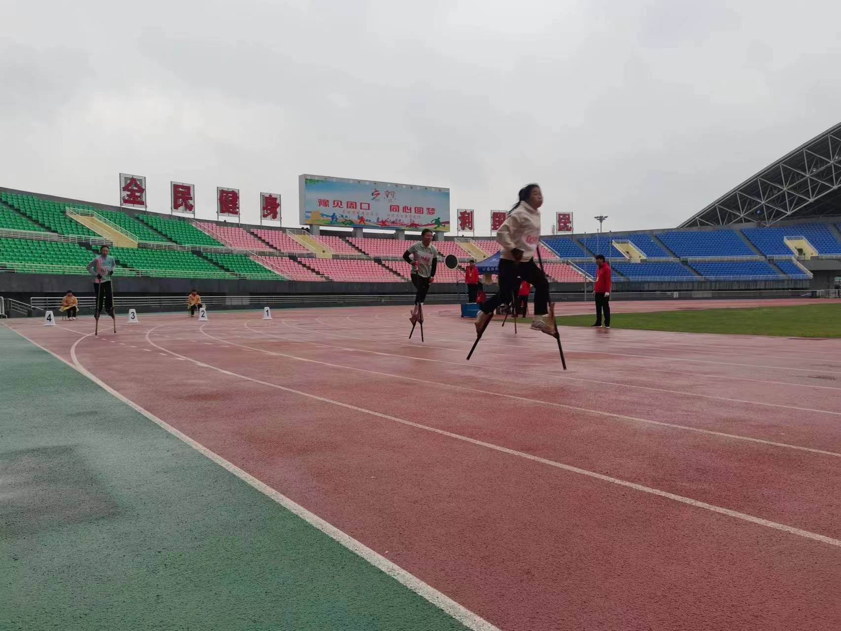 4月23日,河南省第九屆少數(shù)民族傳統(tǒng)體育運動會高腳競速項目預(yù)賽在周口體育中心田徑場開賽。隨著裁判一聲哨響,運動員們腳踩30多厘米的竹馬如離弦之箭向終點飛奔,他們在高腳馬上進(jìn)行著速度和力量的比拼。
