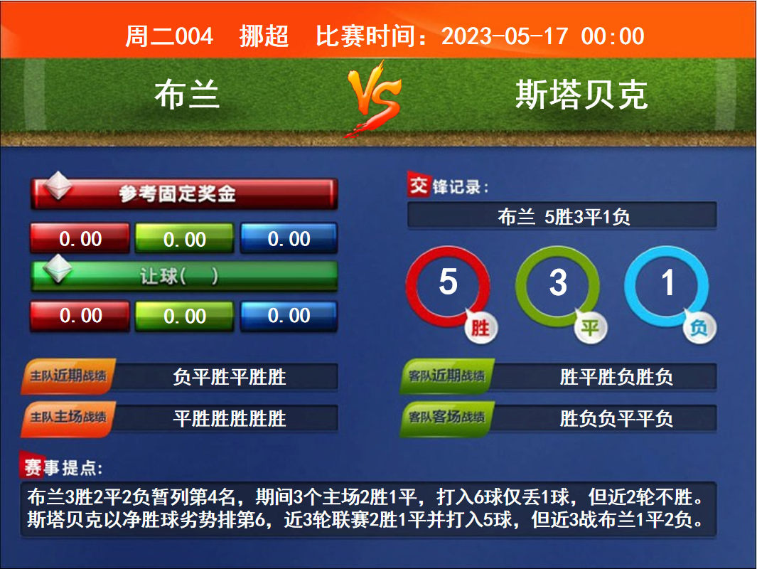 比賽時間:2023-05-17 00:00賽事提點:布蘭3勝2平2負(fù)暫列第4名,期間3個主場2勝1平,打入6球僅丟1球,但近2輪不勝。斯塔貝克以凈勝球劣勢排第6,近3輪聯(lián)賽2勝1平并打入5球,但近3戰(zhàn)布蘭1平2負(fù)。