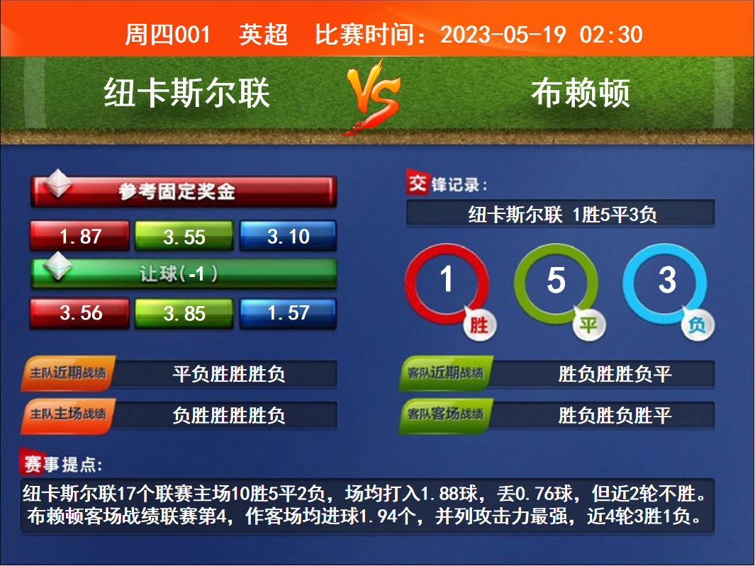 比賽時間:2023-05-19 02:30賽事提點:紐卡斯爾聯(lián)17個聯(lián)賽主場10勝5平2負,場均打入1.88球,丟0.76球,但近2輪不勝。布賴頓客場戰(zhàn)績聯(lián)賽第4,作客場均進球1.94個,并列攻擊力最強,近4輪3勝1負。
