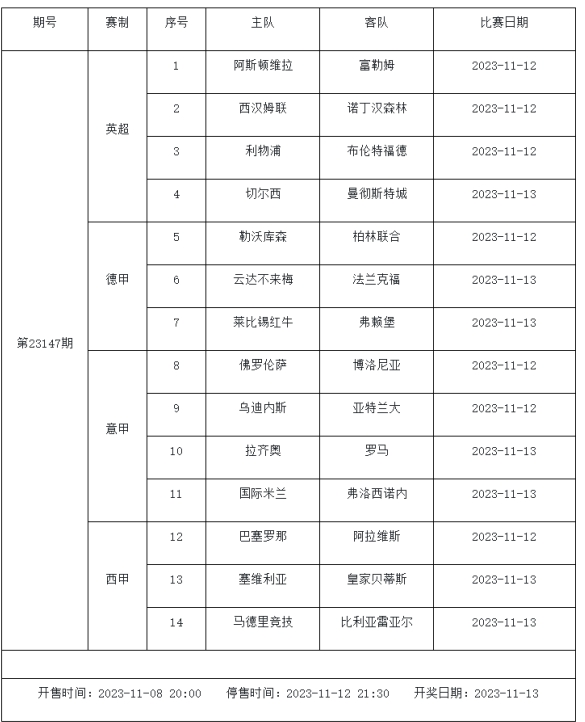 足球彩票勝負(fù)游戲(14場和任選9場)第23147期賽程: