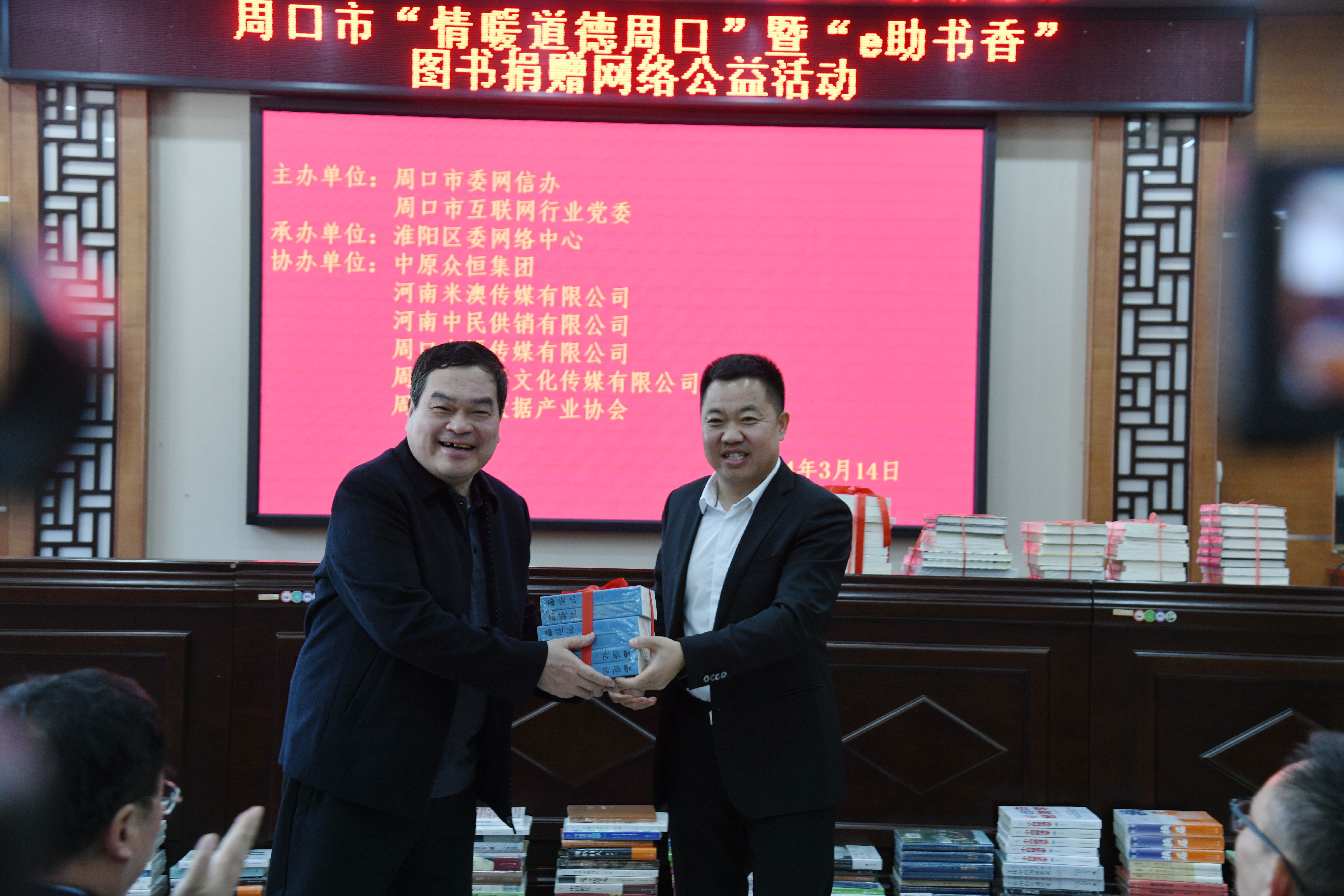 3月11日上午,第二屆周口伏羲書展在淮陽開幕。在開幕式的捐贈環(huán)節(jié),中原越秀實業(yè)有限公司董事長、越秀豐廚(周口)食品科技有限公司董事長李玉平向周口市中小學(xué)校捐贈圖書300萬元碼洋(價值300萬元約6萬冊圖書)。