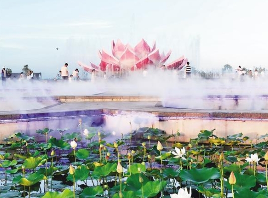 7月3日傍晚,淮陽龍湖荷花苑里,前來乘涼的市民絡(luò)繹不絕。在一朵粉紅色的荷花造型景觀周圍,噴泉映光影、水霧繞碧荷,如夢如幻,宛如仙境。
