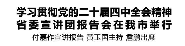 本報(bào)訊(記者 王艷 王晨) 按照省委統(tǒng)一部署,11月24日,學(xué)習(xí)貫徹黨的二十屆四中全會精神省委宣講團(tuán)報(bào)告會在我市舉行。省委宣講團(tuán)成員,省交通運(yùn)輸廳黨組書記、廳長付磊作宣講報(bào)告。市委書記黃玉國主持報(bào)告會,市長詹鵬出席。