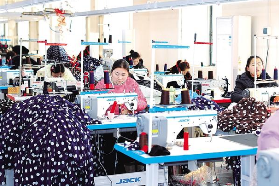 近年來,鄲城縣大力發(fā)展 “村口工廠”,讓群眾在家門口就業(yè)。圖為工人在生產(chǎn)車間里趕制服裝。
