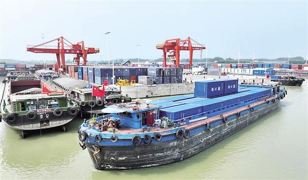 清晨的沙潁河畔,周口港范營作業(yè)區(qū)一派繁忙景象。巍然聳立的橋吊如鋼鐵巨臂,精準地將五顏六色的集裝箱吊裝至貨輪;
