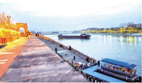 傍晚的普濟(jì)門河畔,石拱門暖燈初上,步道階梯延伸向沙潁河。游船燈串與沿岸燈火在水面搖曳,貨船駛過(guò),游人漫步,絕美景致交織成周口溫柔的暮色畫(huà)卷。