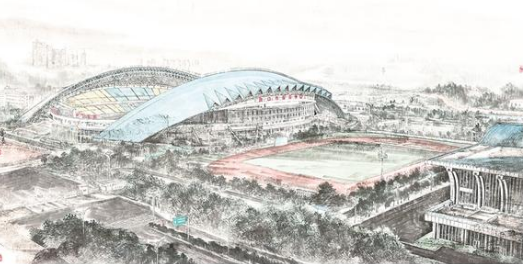 這幅作品以水墨寫實(shí)的表現(xiàn),將周口市體育中心的現(xiàn)代建筑之美定格在宣紙上,力求突出城市蓬勃的生命力。