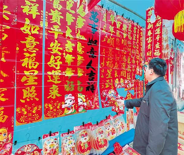 1月11日,市民在挑選對聯(lián)。當日,記者在中心城區(qū)走訪時看到,琳瑯滿目的春節(jié)飾品已火熱上市,不少商家把一個個大紅燈籠高高掛起,市民采購年畫、福字、對聯(lián)、窗花、中國結(jié)等春節(jié)飾品,“囤貨”迎春節(jié)。