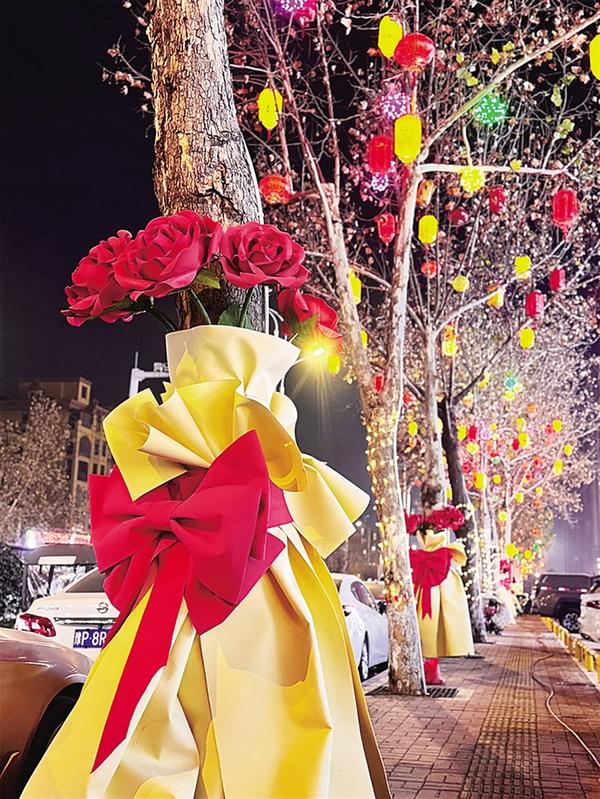 1月15日,記者在慶豐中路(勝利街至西六路段)看到,經(jīng)過精心布置,行道樹搖身一變成為巨型“玫瑰花束”,仿佛是精心準備的城市禮物。