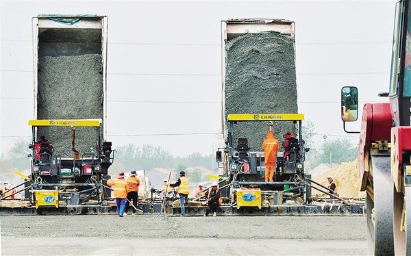 4月24日上午,工人們?yōu)?29國道改建路段鋪設(shè)第一層碎石路基。據(jù)了解,329國道改建路段全長5.879公里,西起商水縣童崗村,折而向南又向東,至后趙寨村,呈直角形,為城市主干道,雙向八車道。