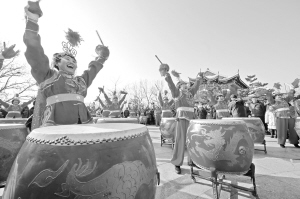 ▲2月24日,在山東煙臺毓璜頂廟會上,老年鑼鼓隊進行威風鑼鼓表演。當日,在山東煙臺毓璜頂廟會上,民間藝人們帶來了大秧歌、威風鑼鼓、舞龍舞獅等民俗表演,為市民和游客獻上精彩紛呈的傳統(tǒng)文化大餐。新華社發(fā)