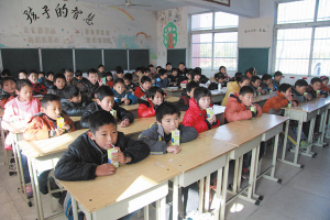 課間,學生正在飲用“學生奶”。