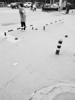 左圖 平原賓館門(mén)前的人行道不知被誰(shuí)裝上了“黃杠杠”,行人只能繞行通過(guò)。