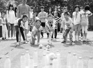 安徽亳州:留守兒童大學校園歡樂迎“六一”       5月24日,在安徽省亳州職業(yè)技術(shù)學院,幾名留守兒童在玩“保齡球”游戲。當日,安徽省亳州職業(yè)技術(shù)學院邀請譙城區(qū)牛集鎮(zhèn)安溜小學50多名留守兒童來到大學校園,開展“放飛夢想迎六一”主題活動。大學生與孩子們一起進行了各種趣味游戲,讓孩子們提前過了一個開心的“六一”兒童節(jié)。新華社發(fā)